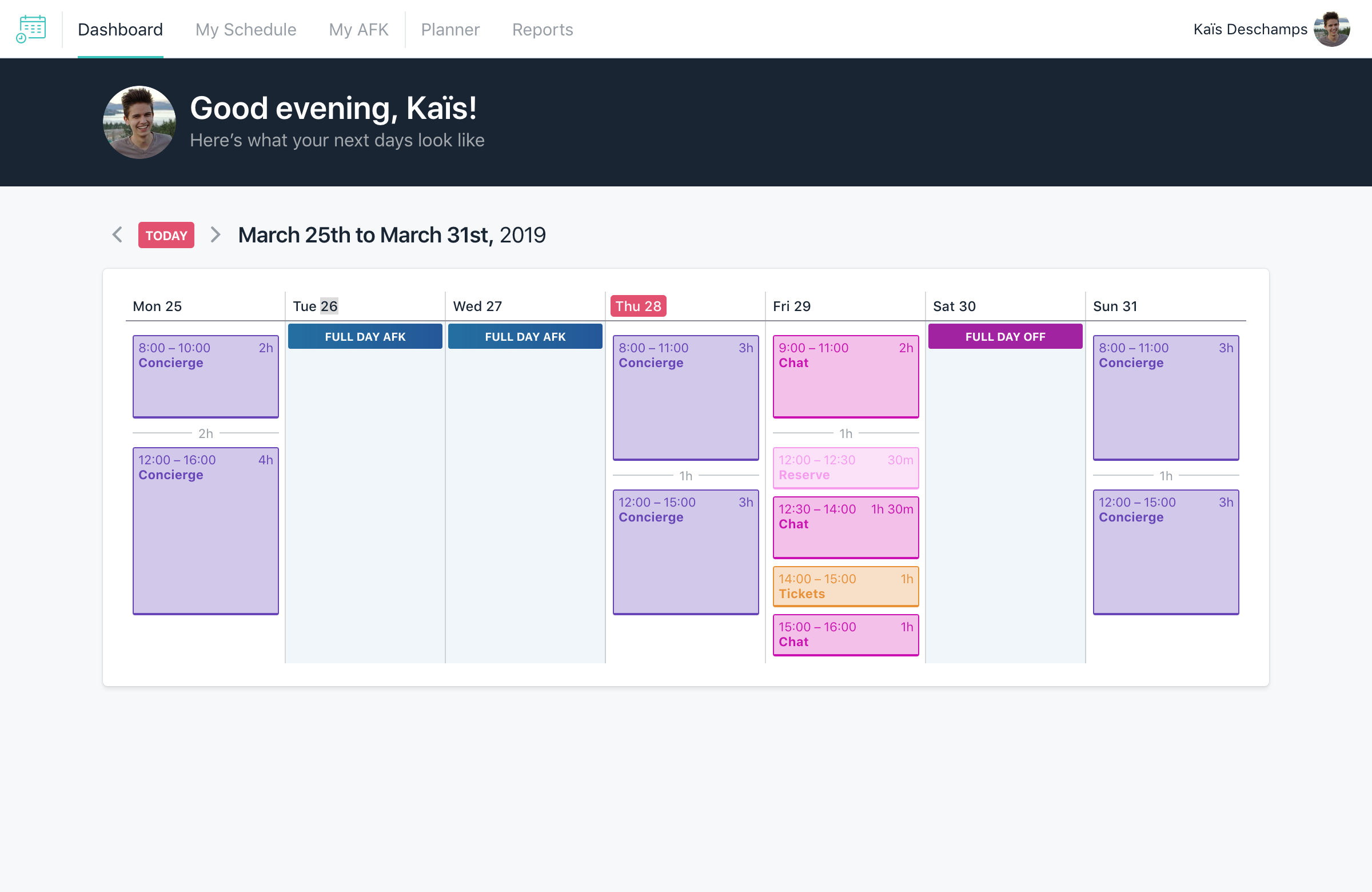 The Dashboard shows you each week of work. See tasks assigned (including breaks in your day), days off, and AFK days. Share this: Click to share on X (Opens in new window) X Click to share on Facebook (Opens in new window) Facebook Like Loading...