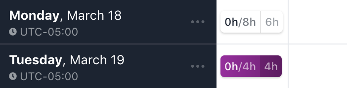 The Day Details widget gives information about the user’s day to help guide decisions about availability and task assignments. It shows slightly different information depending on what section you’re looking at.