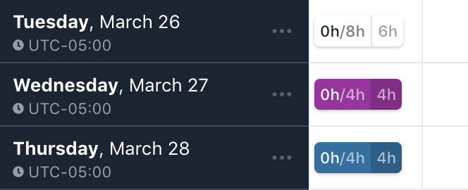 In Planner and My Schedule the Day Details widget will indicate if a day is Half Off or Half AFK. They’ll have the same background color as Full Days Off (purple) or Full Days AFK (blue). But since you’re still working part of the day, they also show your availability and task requirements like regular working days.